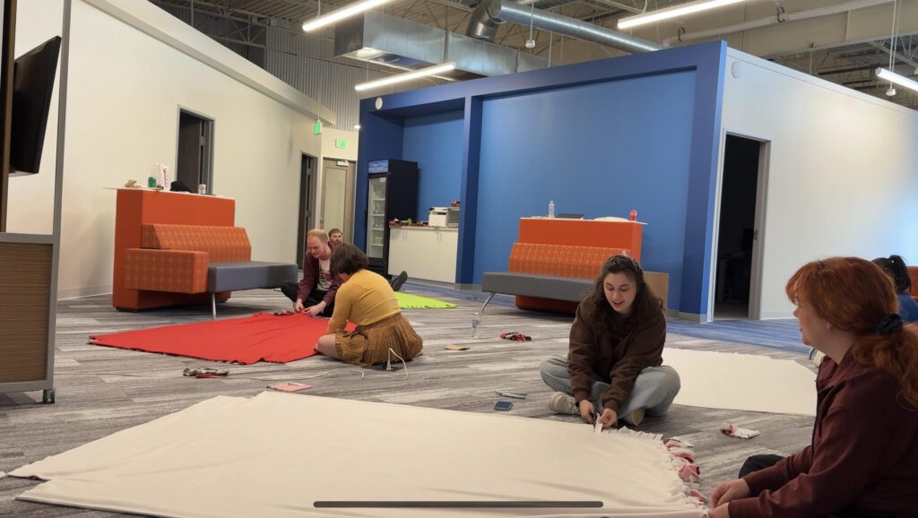 Arianna, Steve, Ian, Hannah, Sophie, and Loren split into a rhythm pretty quickly. We spread out across the floor with fabric around us, working through each blanket. Some of us cut the fabric while the others tied. By the end of the night, we had a stack of blankets ready to go. Each one was made for someone we won’t meet, but someone we know might need it.