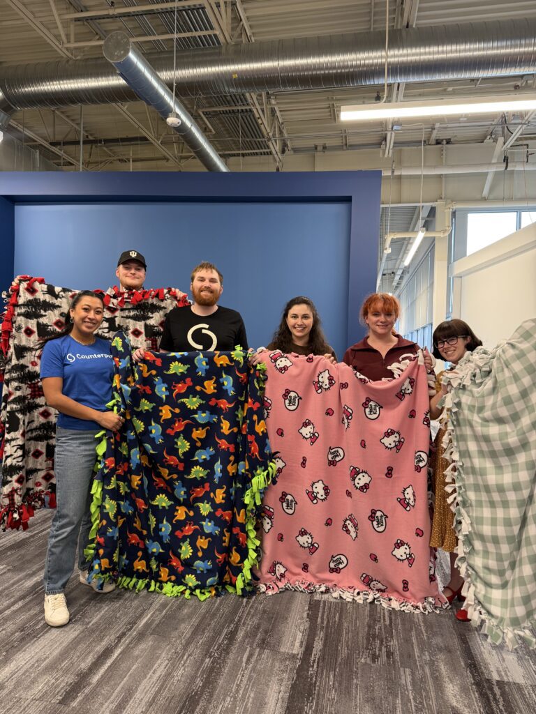 After work one evening, we stuck around the office a little longer, ordered pizza, and set up to make blankets for Brooke’s Place and their Holiday Store.